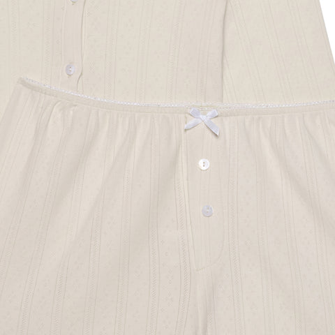 This cosy and chic pointelle PJ set is made from a quality 100% pure cotton for long-lasting softness. The cardigan is long-sleeved, fitted and has a front button closure design. Paired with our cool girl, elasticated waist band matching short finished with three mini centre buttons. Mix and match with our pointelle bra or soft sleep crop for endless elevated home fits.